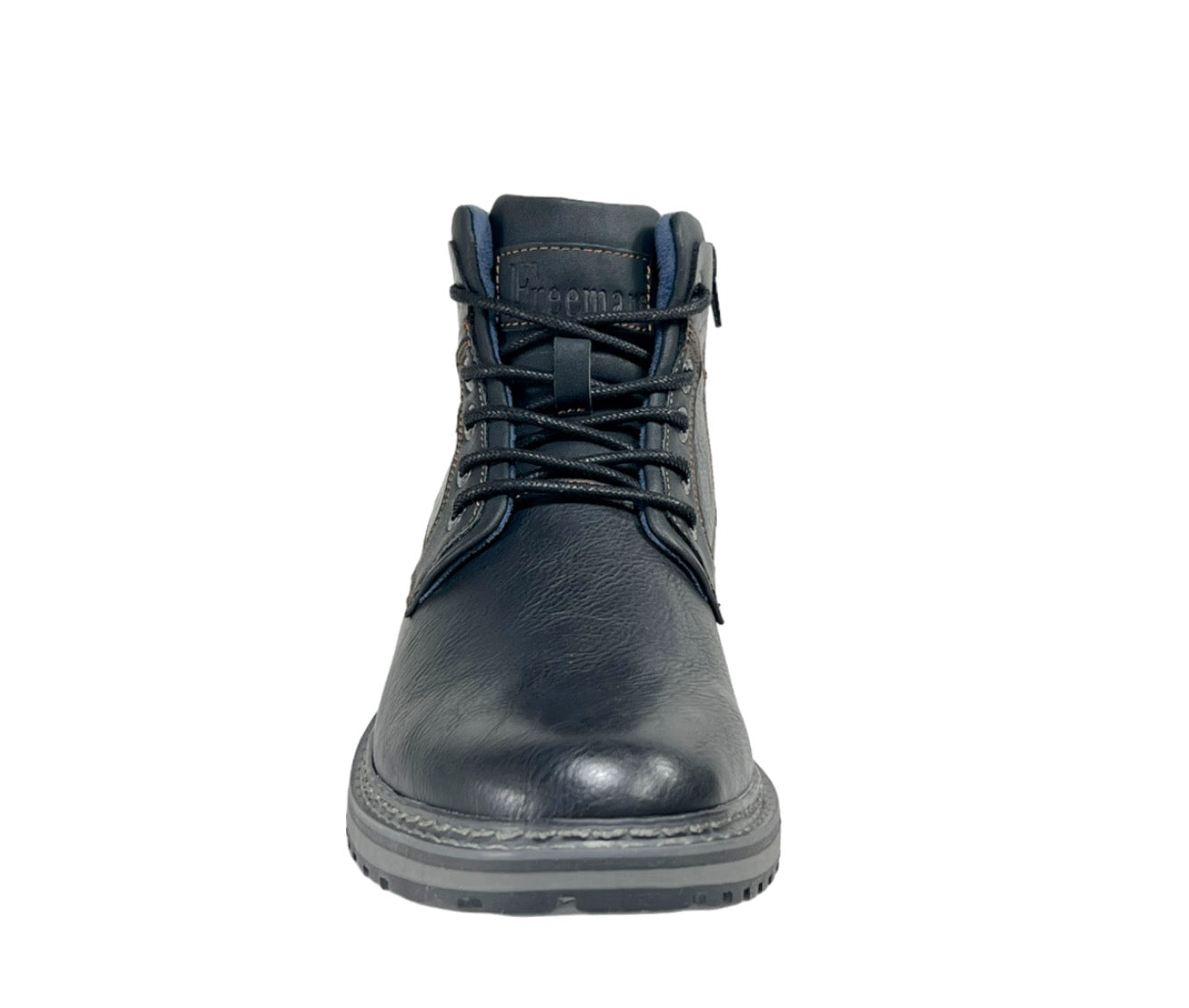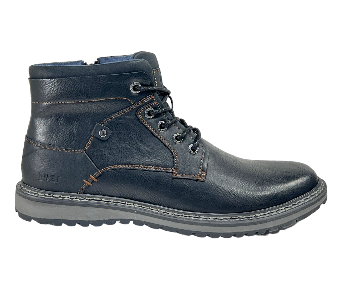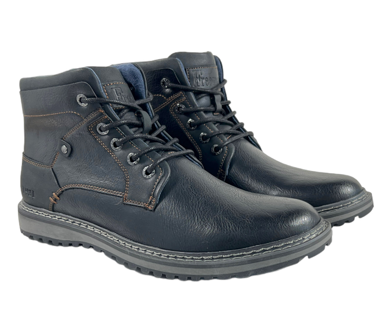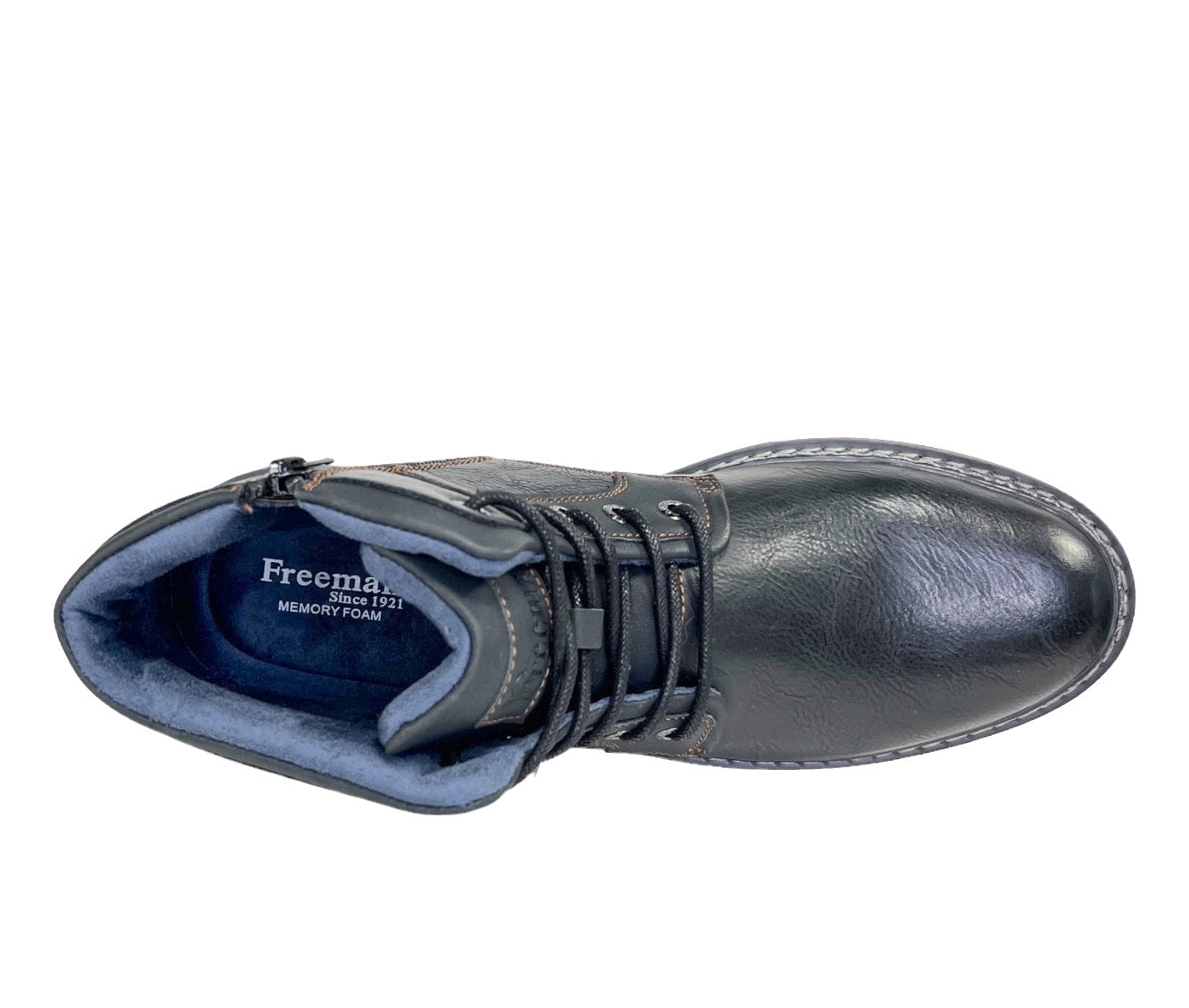 Introducing the Grady Rugged Casual Shoe from Freeman "1921". This modern footwear features a round toe shape and a faux leather upper adorned with accent stitching. The shoe is designed with a padded tongue and collar for added comfort, as well as a convenient five-eye lace-up design with waxy "Stay-tied" laces and an inside zipper for easy entry. The breathable microfiber linings ensure proper ventilation for your feet. For optimal support and comfort, the shoe comes with a memory foam cushioned, removable footbed. The textured TPR outsole offers excellent traction, while the multi-color midsole design and top stitch welt accent add a touch of style. Look sharp and stylish with the Freeman "1921" Brand Details on this lightweight and versatile shoe.