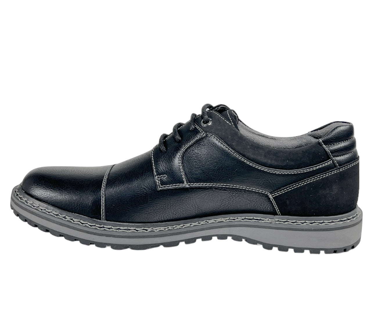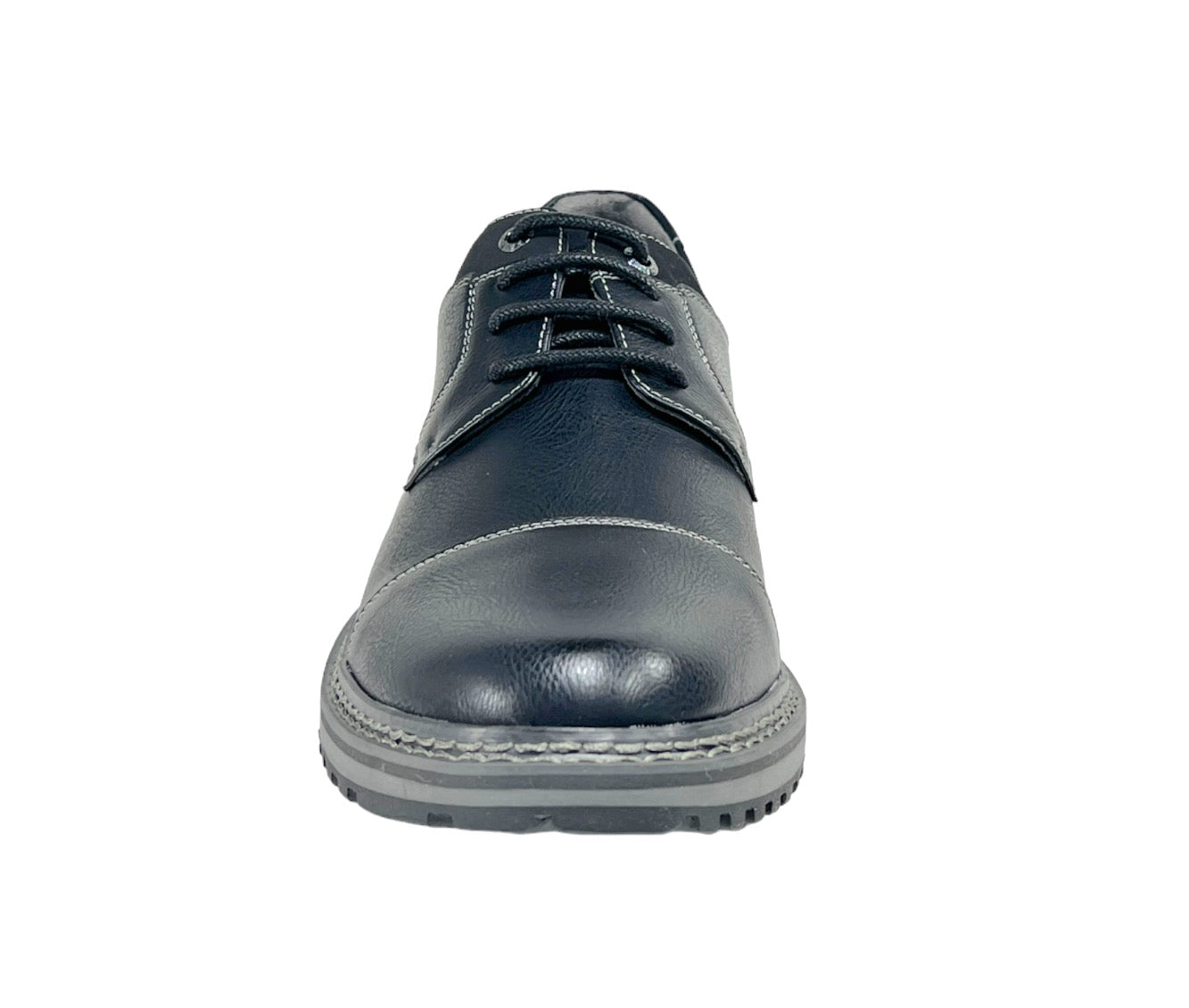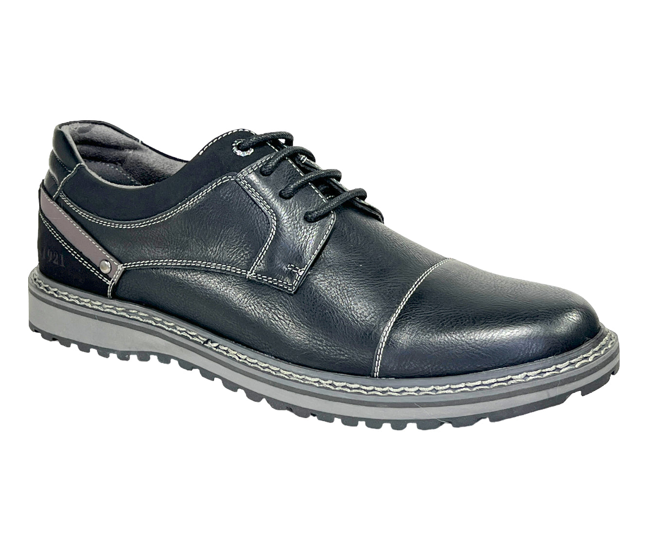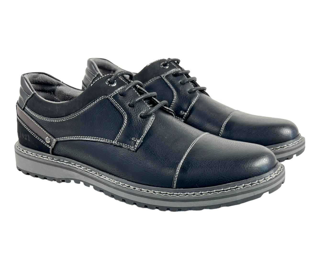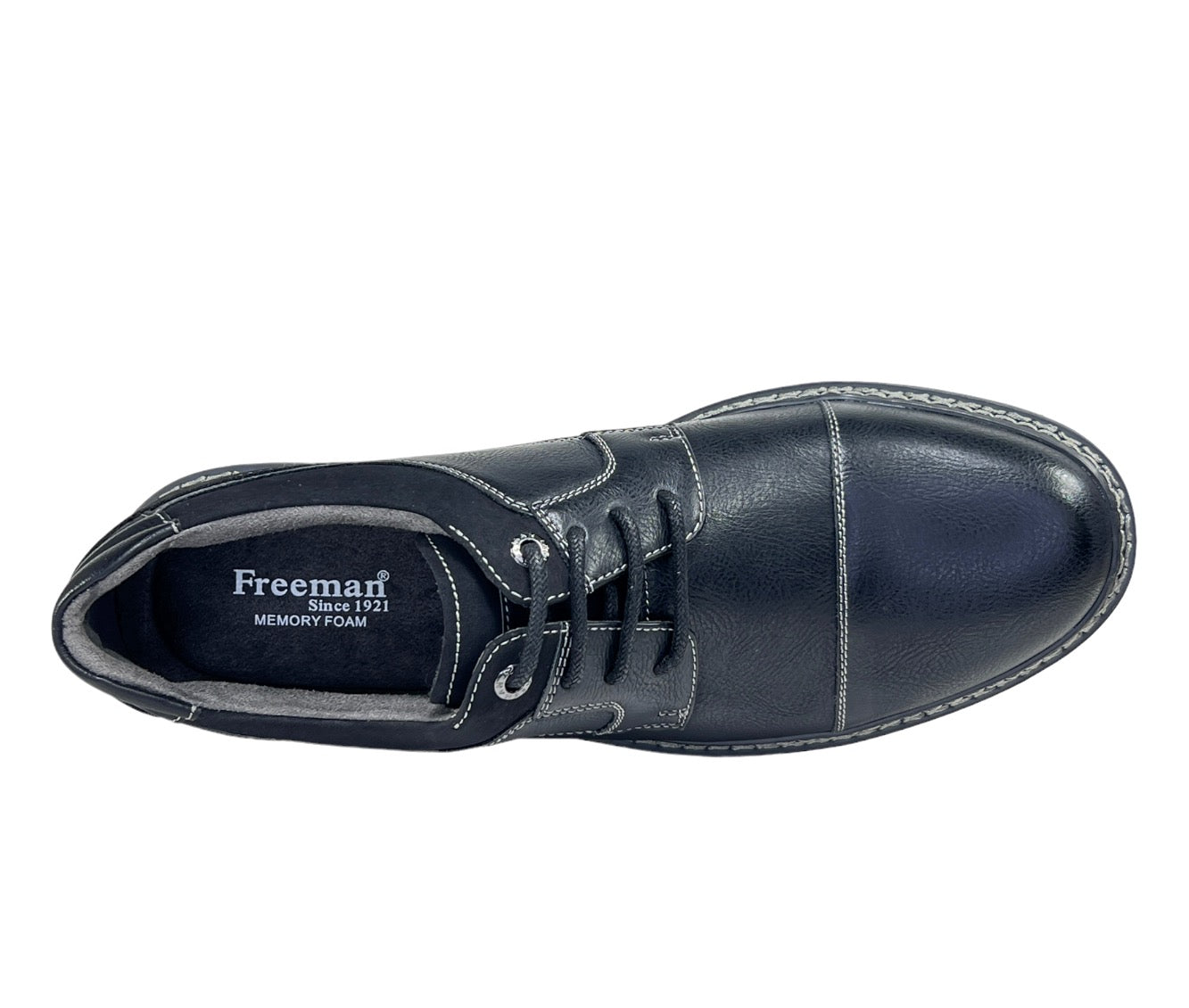 Our Jason Shoe boasts a contemporary round toe shape and a faux grain leather upper embellished with accent stitching. It features a four-eye lace-up design with durable "stay-tied" laces. The breathable microfiber linings ensure maximum comfort. Additionally, the memory foam cushioned footbed can be easily removed for extra support. The traction TPR outsole offers optimal grip, while the two-color sidewall design and top stitch welt accents add a touch of style. Lastly, the Freeman "1921" brand details add an element of sophistication.