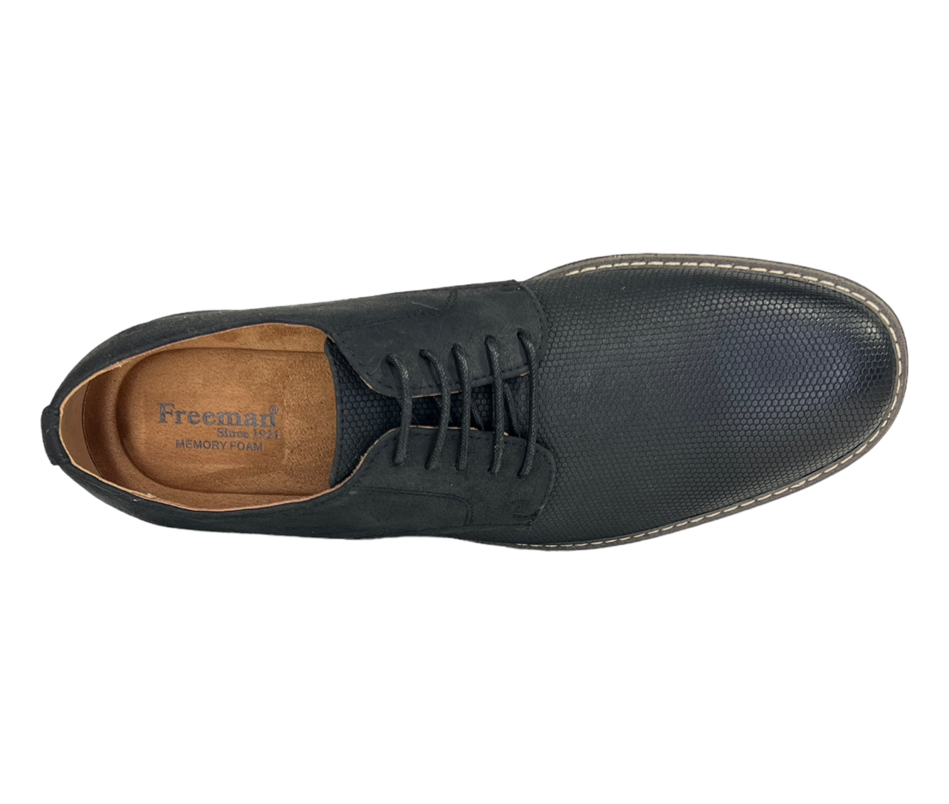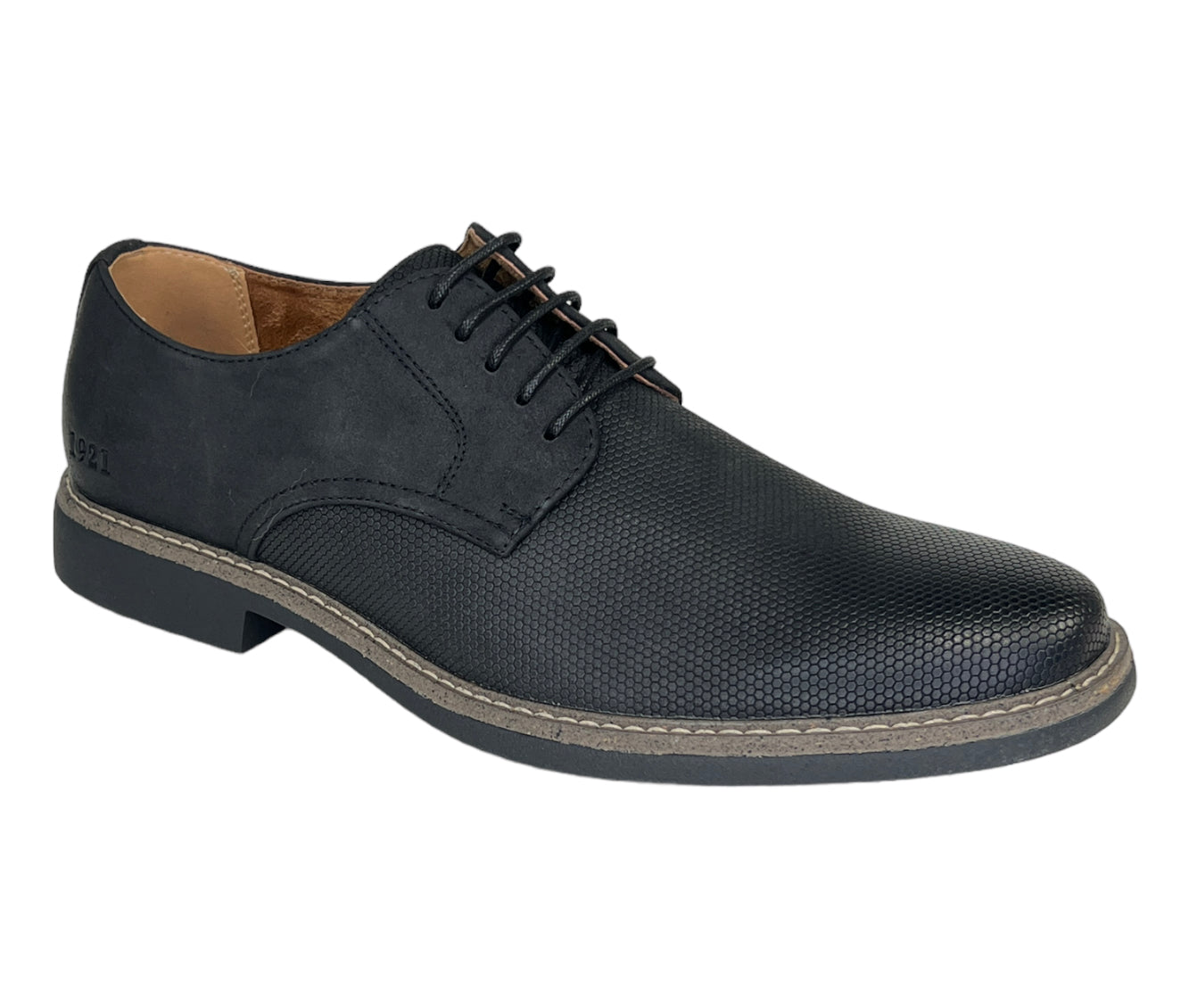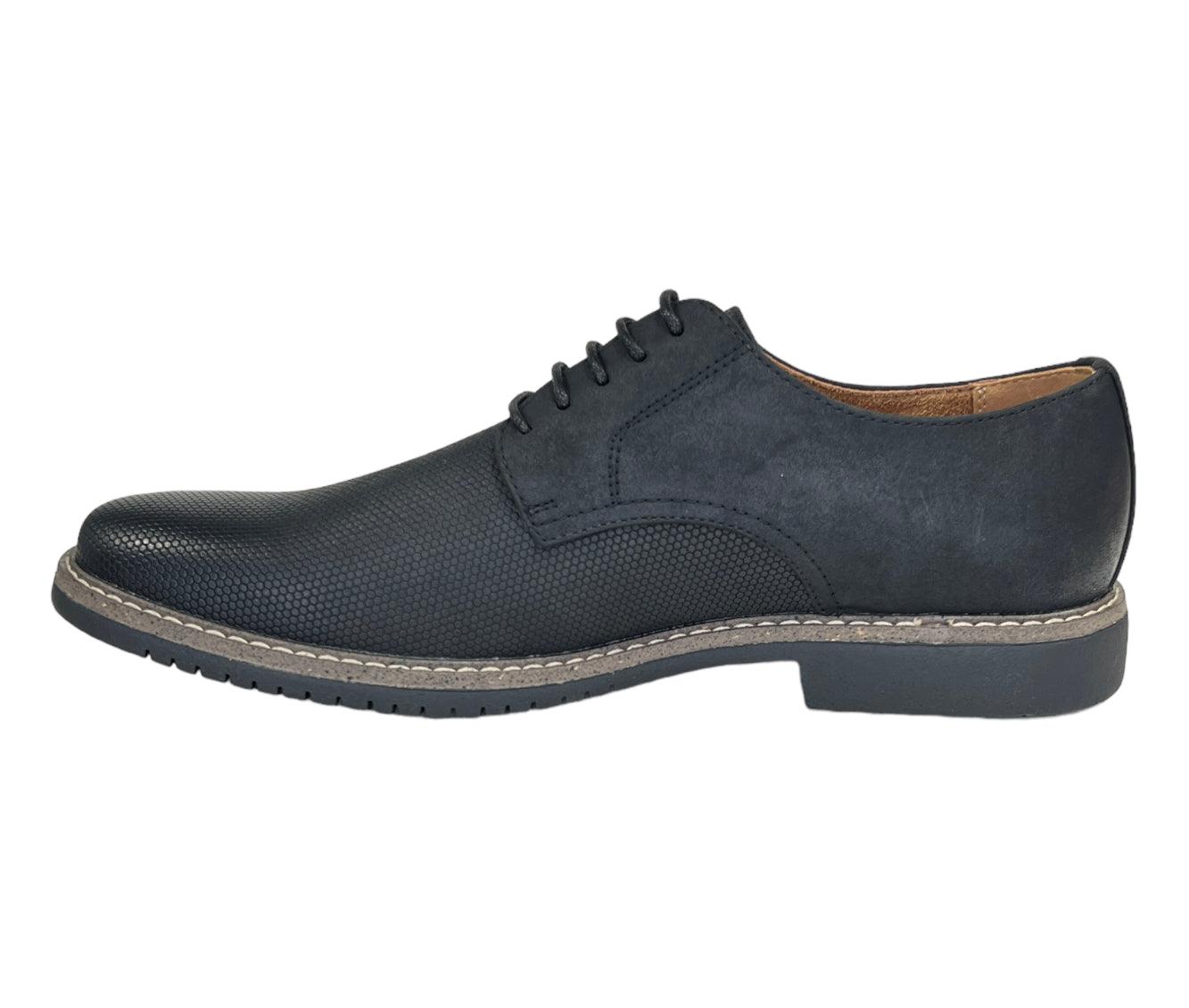 Introducing the Milton from our Dress Casual collection, a stylish shoe that exemplifies sleekness. This variant boasts a modern, round toe shape and an embossed faux leather upper. Its five-eye lace-up design comes with waxy "stay-tied" laces, ensuring a secure fit. The shoe also features breathable microfiber linings and a memory foam cushioned, removable footbed for ultimate support and comfort. Completing the design is a textured traction TPR outsole with a stitch welt.