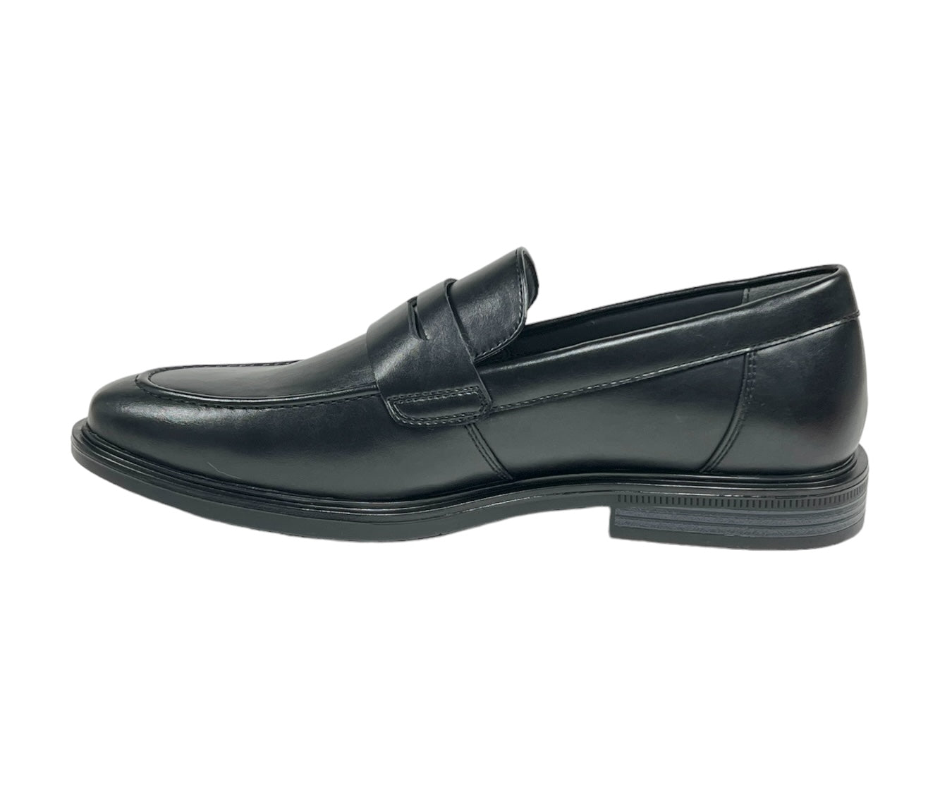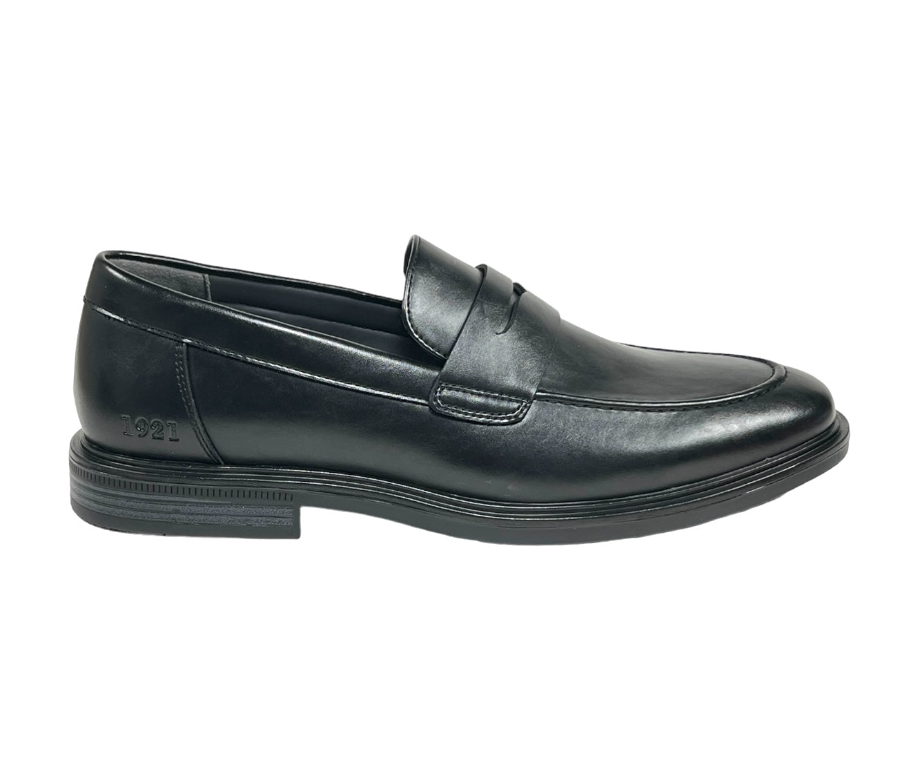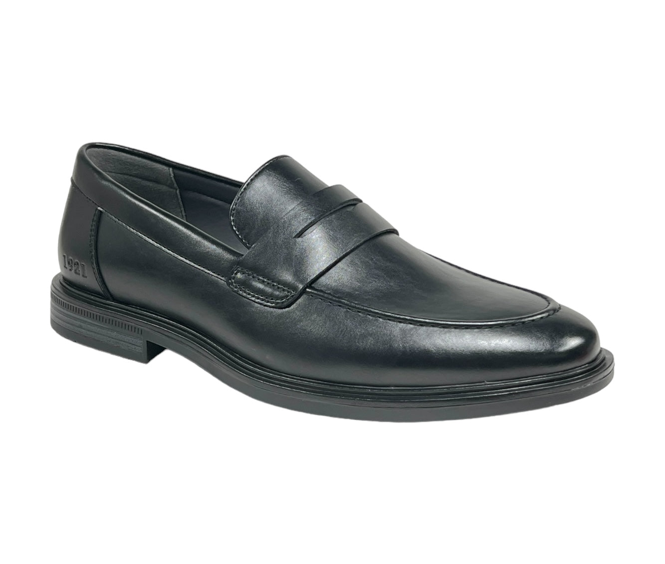 Immerse yourself in the modern round toe shape of the Ryan. Its imitation grain leather upper, combined with a textured heel, adds a touch of sophistication. The penny loafer vamp brace enhances both style and functionality. With a lightly padded collar and breathable microfiber linings, your comfort is our priority. The memory foam cushioned, removable footbed provides excellent support. Step with confidence on the textured traction TPR outsole, accentuated by a stacked heel visual. Discover the Freeman "1921" Brand details that epitomize timeless elegance.